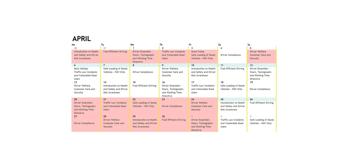Here is the course schedule for April 2026 - Dates in Red are fully booked. For our Driver CPC training courses, click the required course links below or call 01205 821876 to book directly. If you require the full 5 courses, including HGV Class 1 training, select the discounted link or choose your 5 dates. The discount